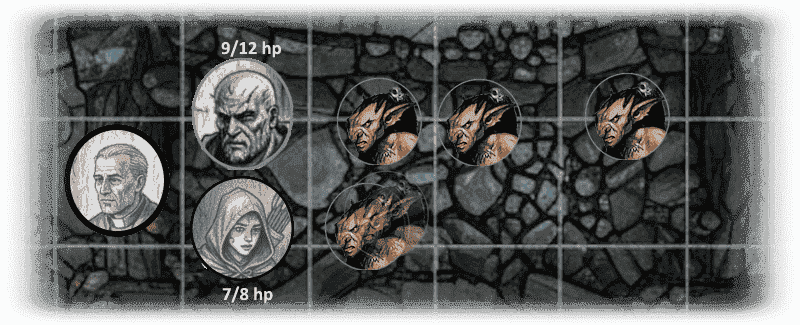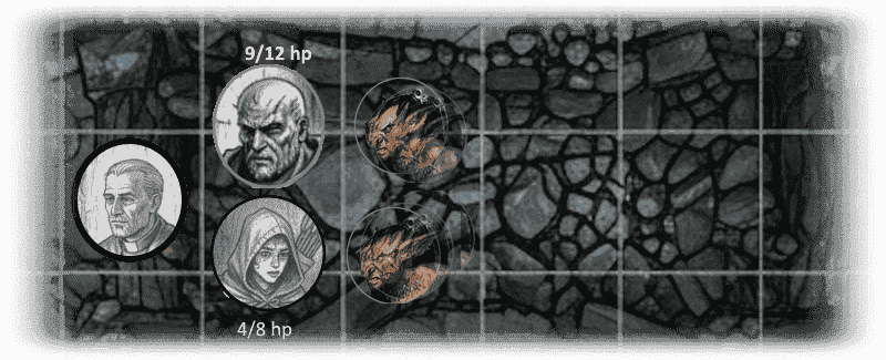 Round 4: Dorn kills a rat, Exie misses, and Aele cries out to Cromm (Thoth?) for healing and regains five hit points and is back at maximum health. Two rats remain. One bites Dorn for another point of damage and the other misses Aele. Round 5: Dorn misses, but Exie hits, killing the rat that attacked Dorn. Father Truemas kills the remaining rat, and the PCs are victorious!