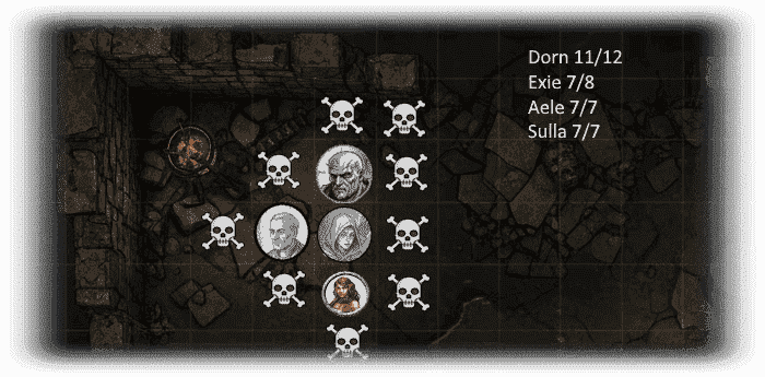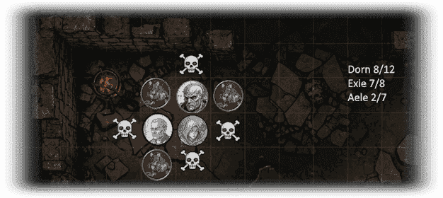 Our three heroes patch one another up as best they can, deciding to forego using the only three healing potions that Aele is carrying. Exie 5/8, Dorn 10/12, Aele 7/7.