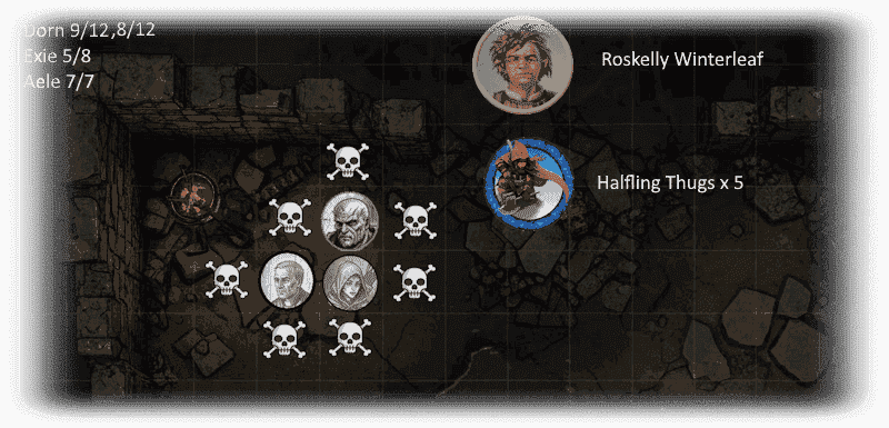 Round 3 begins. For map clarity, I'll hide the slain goblins. Also, I forgot to give Exie her specialization in short sword, and have corrected it.