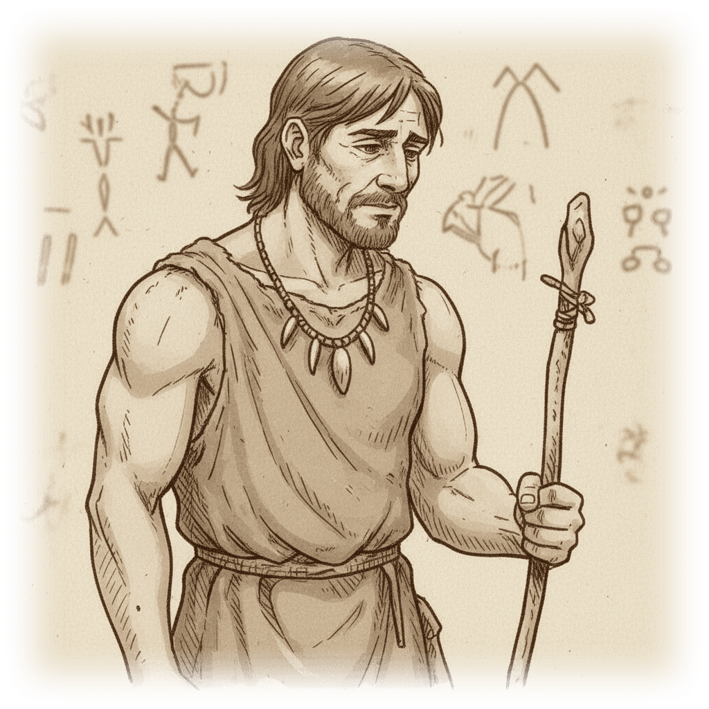 Stenn is a homo sapiens of the post-Châtelperronian culture. He goes 200 pounds and stands 5'6" tall. He has dark, thick red hair on his head, and is very hairy on his chest, back, arms, and lower legs. A prominent brow ridge protrudes over blue eyes the color of ice during the day when it is shaded from direct sunlight. One of Stenn's prized possessions is a supple leather pillow fashioned a few years ago that he has stuffed with dried leaves and portions of his own hair — on those seldom occasions when he (or Norda) cuts it. Thin lips and a weak chin are mostly hidden by thick facial hair, though Stenn carefully saws off the hair above and immediately below his lips when it lengthens. He doesn't like the way it gets in his mouth when he's eating — and Stenn eats as often as he can possibly manage. Stenn's biological age is approximately nineteen years, though age can be hard to estimate among the Bear-Men, given their craggy features carved by a lifetime of harsh weather. |